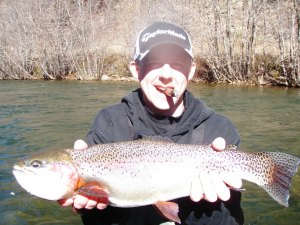 The rainbow on the left ate a brown leech pattern behind an egg. Guess it figured it would eat the ham first. Picking up a bunch of fish using that technique. Just put the leech about 4″ below the egg under an indicator.