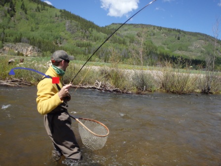 In the far left picture, I am keeping lateral and up pressure during the transition. If that fish came loose the fly rod would react more “up” than away, and toward the bank behind me. The goal is to make that reaction as minimal as possible. That would mean you are using the fly rod angles and pressures perfectly. Look at the picture on the right. This was on a guide trip, and this client had rarely had a fly rod in hand. He was ready to land his own fish by the end of the day. If the fish were to come unbuttoned at the instant the picture was snapped, his reel and hand, if the correct angles and pressure were installed, would move to the red square position. If improper angles and pressures were installed, the the reel would move to the end of the blue line violently. It’s observable on the anglers part, and easily correctable.