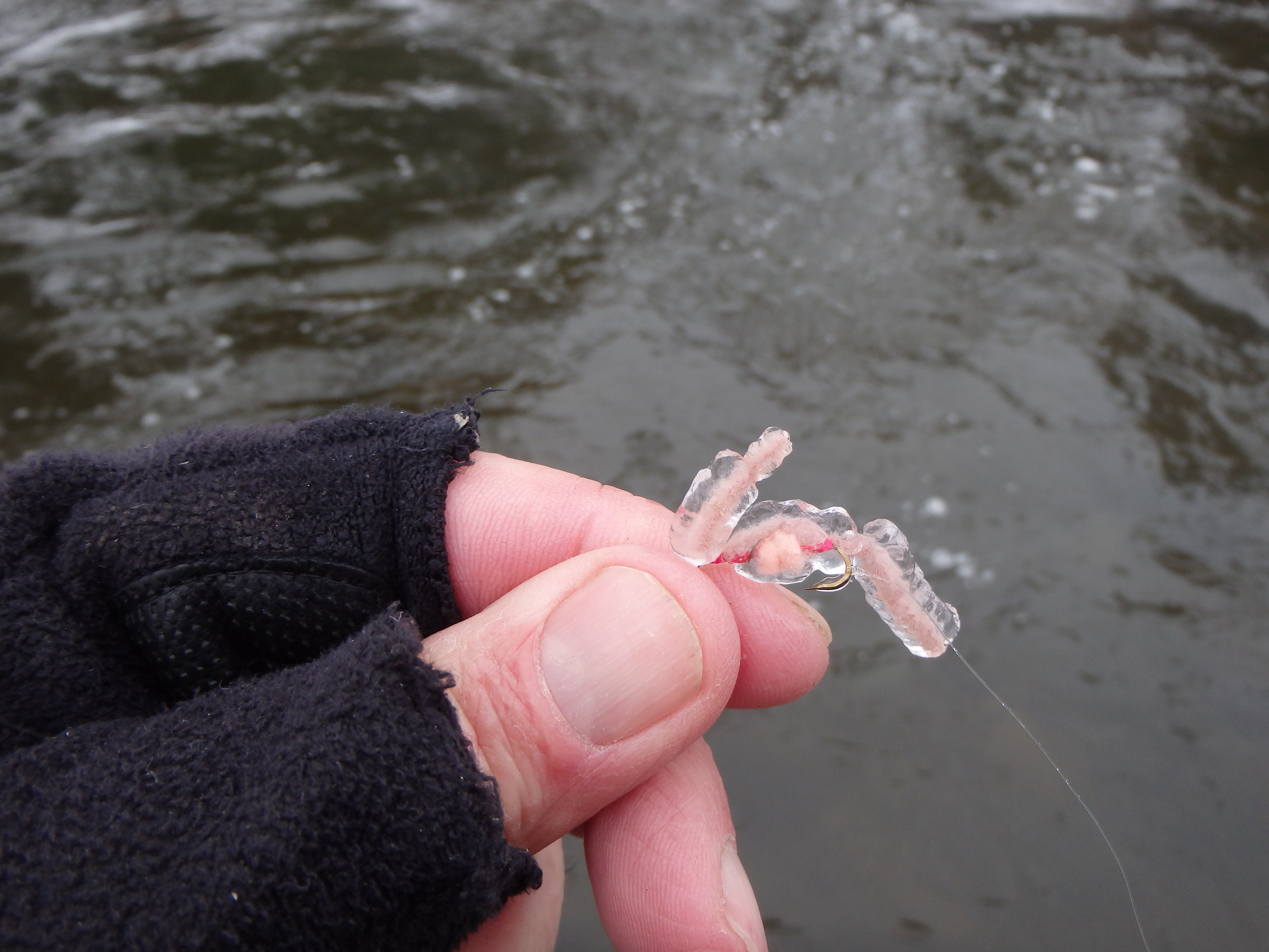 In high water conditions, it’s difficult to get the flies down quickly to fish levels. Fish levels in that water are typically in the lower columns, and more often than not, the fish are using bottom structure to fight the current. Same goes in slush, the fish are holding low to the bottom to escape flowing ice and will move side to side minimally to eat. Factor in the cold water conditions (37 degrees) and they will “sway” even less. They still gotta eat.